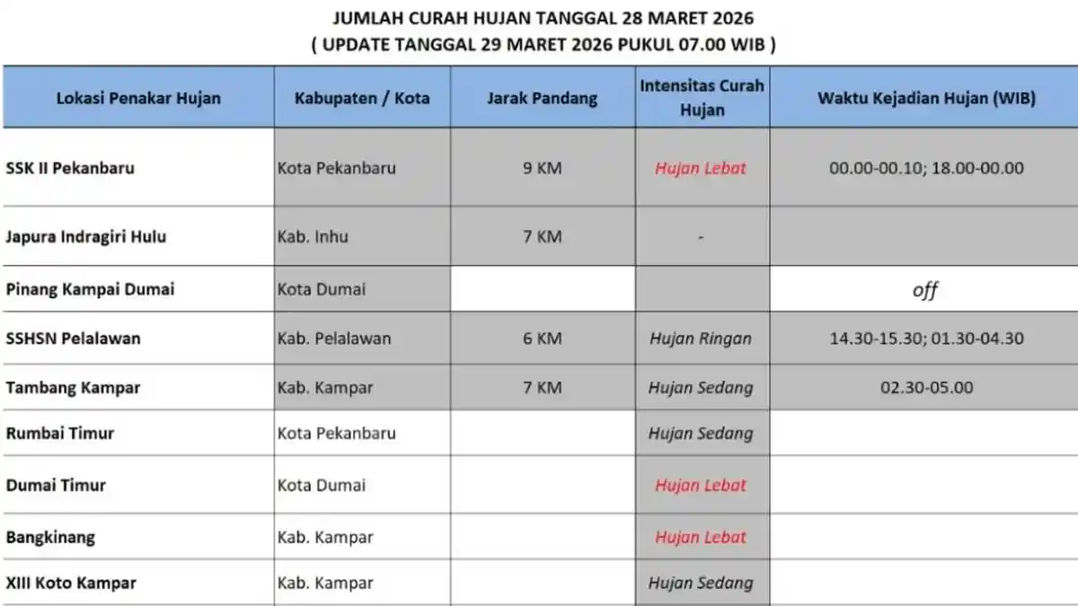Prakirawan Badan Meteorologi, Klimatologi, dan Geofisika (BMKG) Stasiun Pekanbaru, Deby C, menyampaikan bahwa sejak pagi hari hujan sudah mengguyur sejumlah wilayah, di antaranya Bengkalis, Siak, Kampar, Rokan Hulu, Rokan Hilir, Kuantan Singingi, Dumai, serta Pekanbaru.