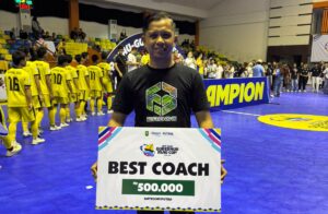 Pelatih Futsal Siak, Revalino menjadi Pelatih terbaik di Kejurda Futsal Piala Gubernur Riau Cup 2026. (AFP Riau).